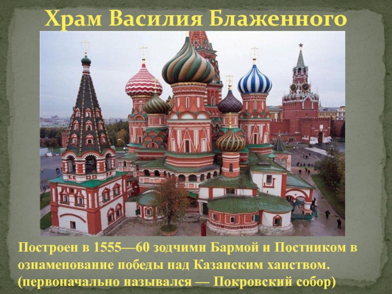 Слайд 24Построен в 1555—60 зодчими Бармой и Постником в ознаменование победы над