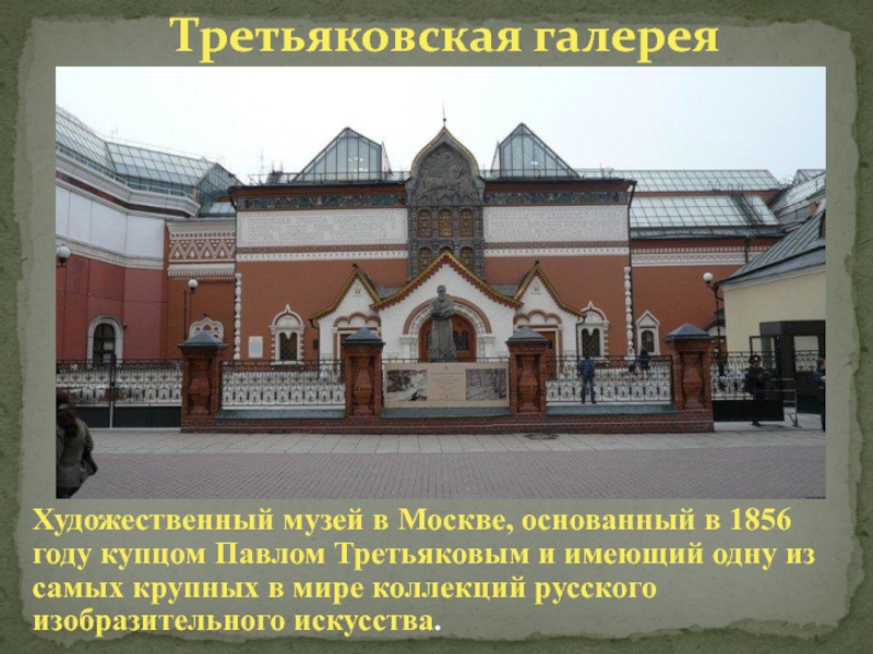 Слайд 40Художественный музей в Москве, основанный в 1856 году купцом Павлом Третьяковым