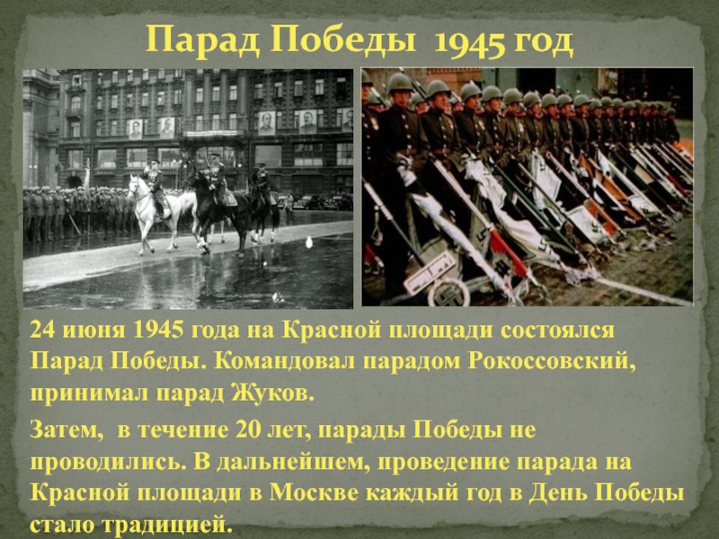 Затем, в течение 20 лет, парады Победы не проводились. В дальнейшем, проведение парада на Красной площади в Москве каждый год в День Победы стало традицией.