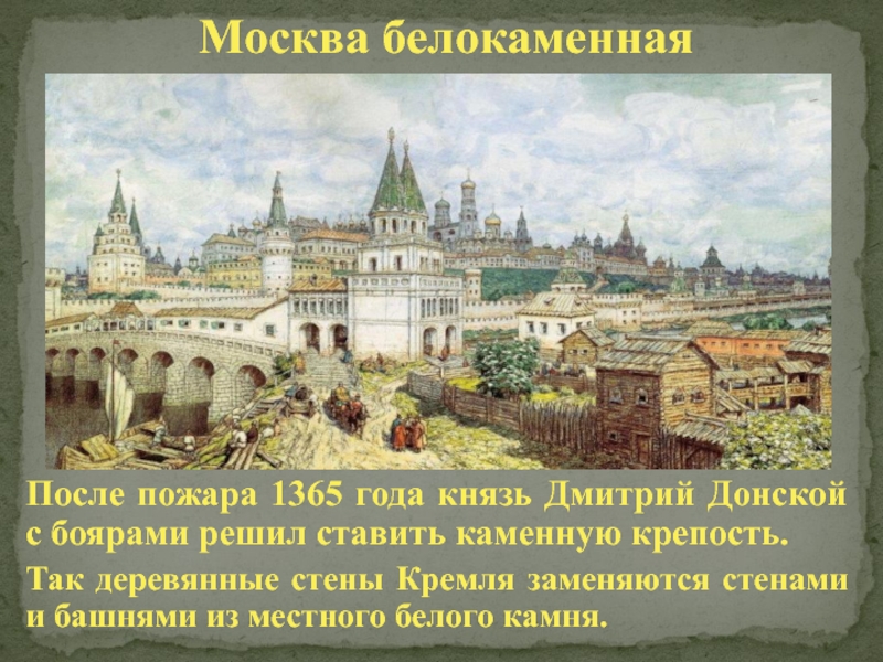 Так деревянные стены Кремля заменяются стенами и башнями из местного белого камня.