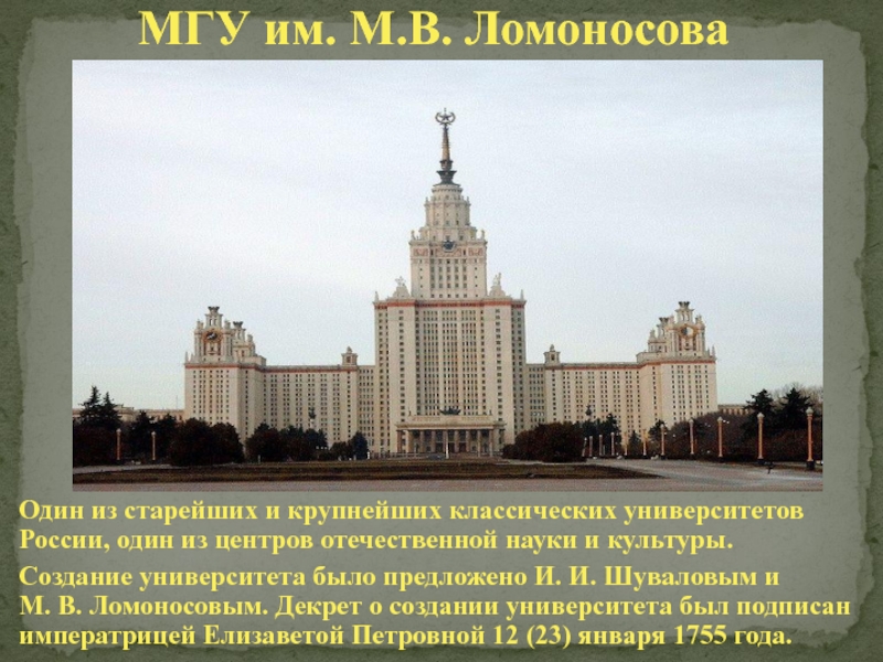 Создание университета было предложено И. И. Шуваловым и М. В. Ломоносовым. Декрет о создании университета был подписан императрицей Елизаветой Петровной 12 (23) января 1755 года.