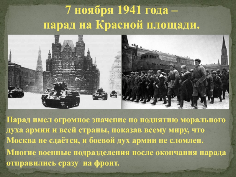 значение по поднятию морального духа армии и всей страны, показав всему миру, что Москва не сдаётся, и боевой дух армии не сломлен.