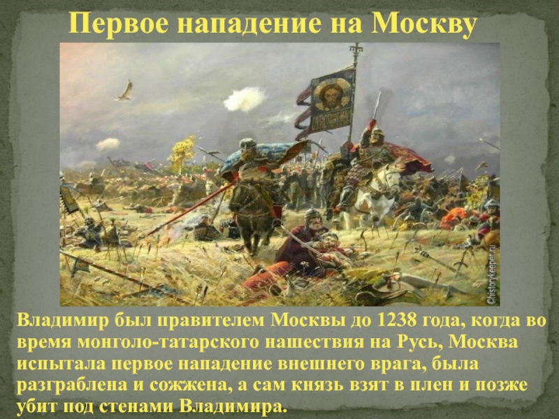 во время монголо-татарского нашествия на Русь, Москва испытала первое нападение внешнего врага, была разграблена и сожжена, а сам князь взят в плен и позже убит под стенами Владимира.