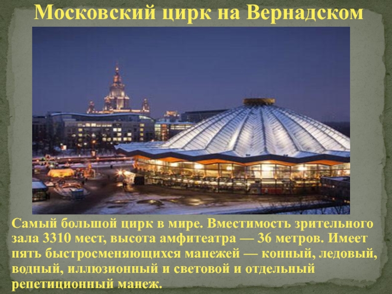 Слайд 41Самый большой цирк в мире. Вместимость зрительного зала 3310 мест, высота