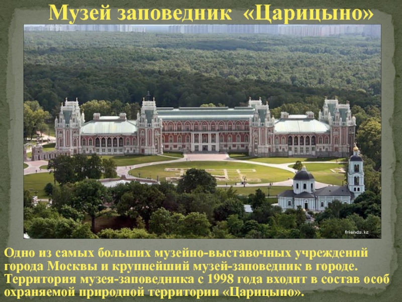 крупнейший музей-заповедник в городе. Территория музея-заповедника с 1998 года входит в состав особ охраняемой природной территории «Царицыно».
