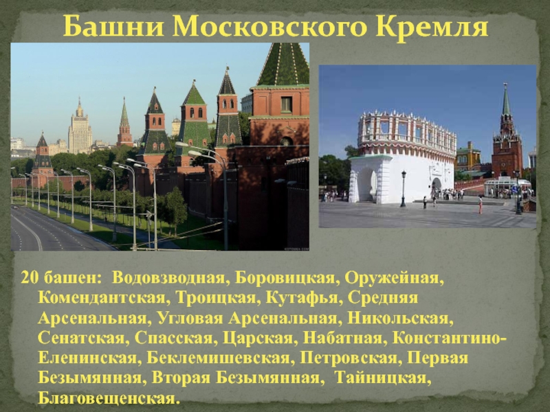 20 башен: Водовзводная, Боровицкая, Оружейная, Комендантская, Троицкая, Кутафья, Средняя