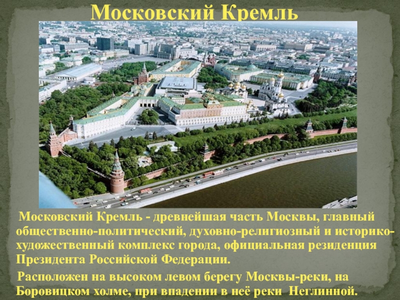 общественно-политический, духовно-религиозный и историко-художественный комплекс города, официальная резиденция Президента Российской Федерации.