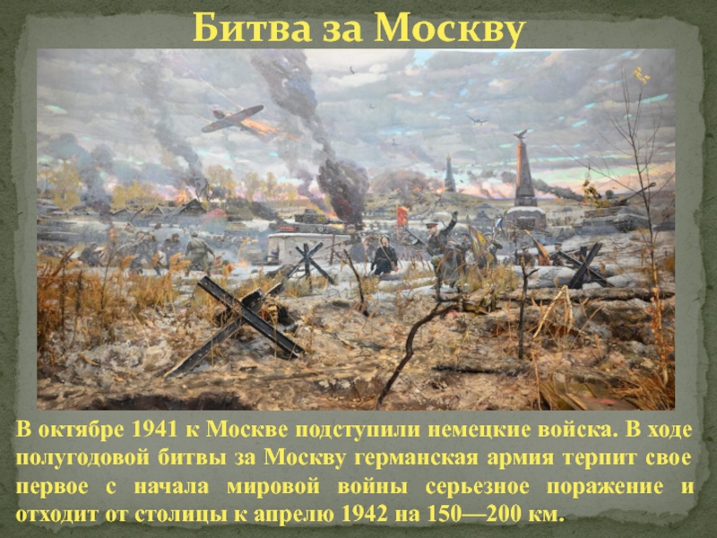 ходе полугодовой битвы за Москву германская армия терпит свое первое с начала мировой войны серьезное поражение и отходит от столицы к апрелю 1942 на 150—200 км.