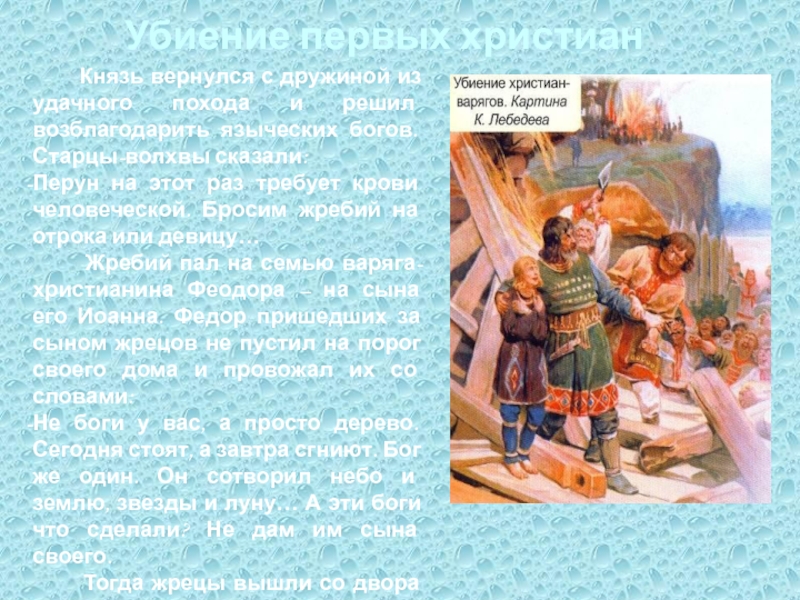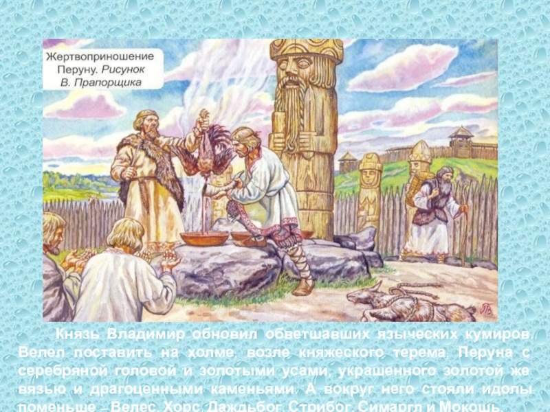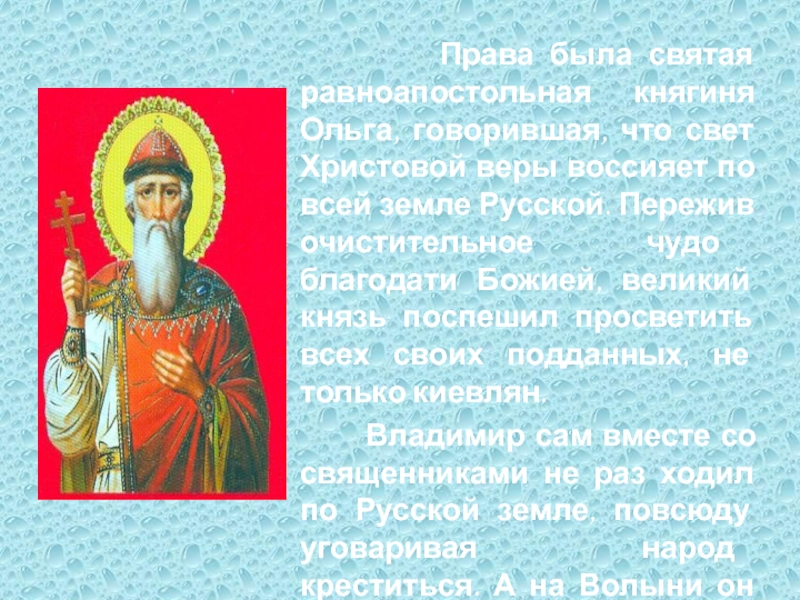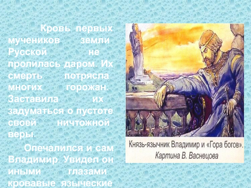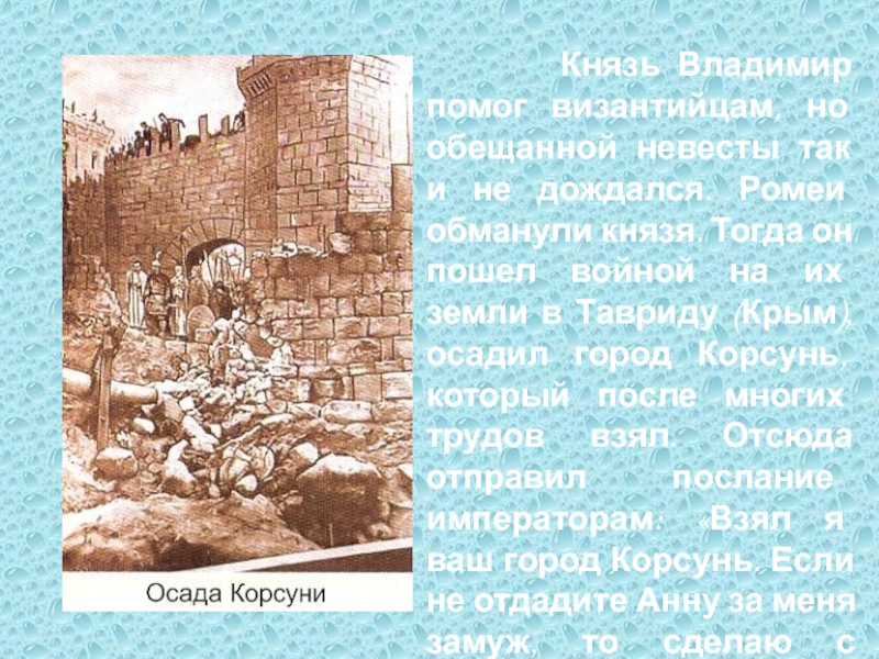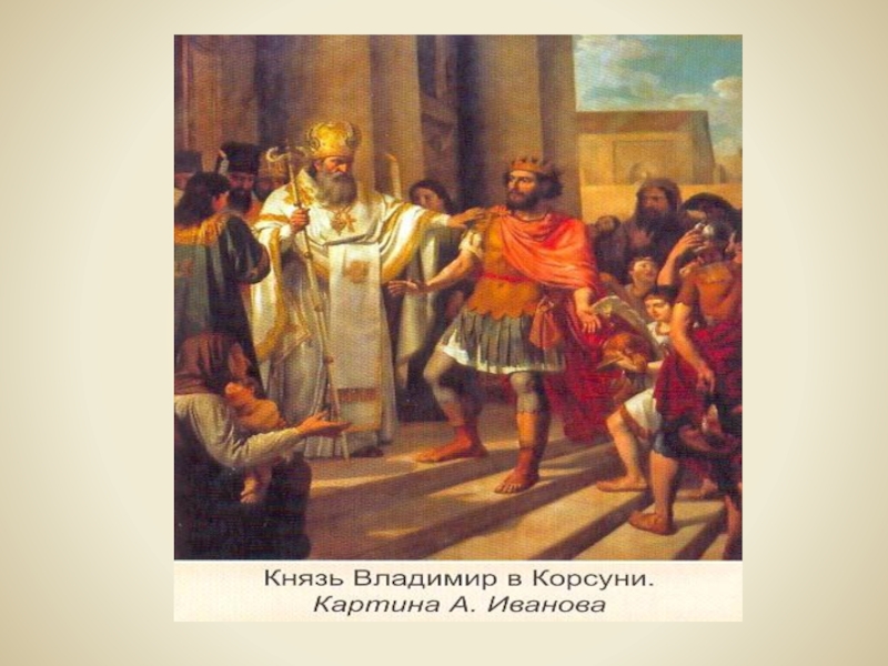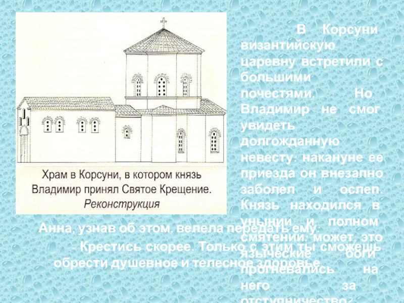 В Корсуни византийскую царевну встретили с большими почестями. Но Владимир не смог увидеть долгожданную невесту: накануне ее приезда он внезапно заболел и ослеп. Князь находился в унынии и полном смятении: может, это языческие боги прогневались на него за отступничество?