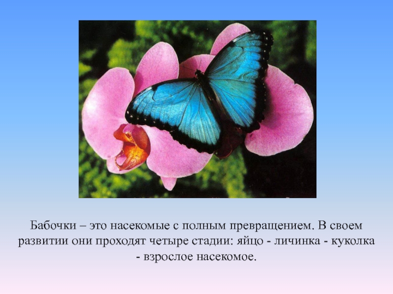 Слайд 28Бабочки – это насекомые с полным превращением. В своем развитии они