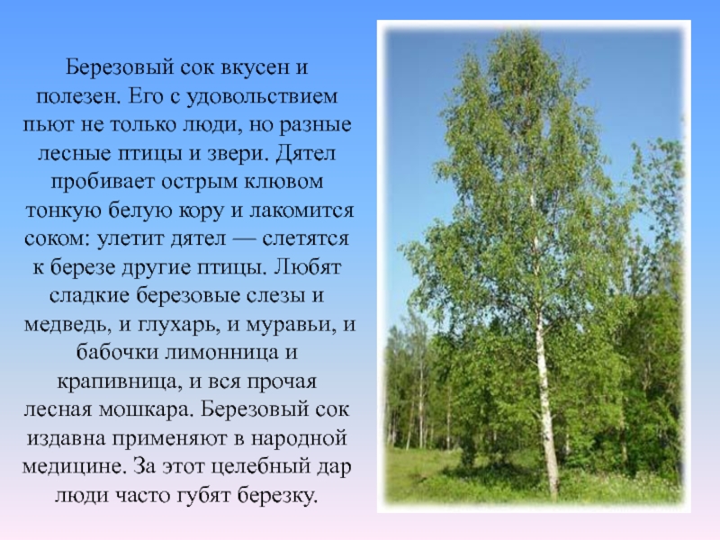 люди, но разные лесные птицы и звери. Дятел пробивает острым клювом тонкую белую кору и лакомится соком: улетит дятел — слетятся к березе другие птицы. Любят сладкие березовые слезы и медведь, и глухарь, и муравьи, и бабочки лимонница и крапивница, и вся прочая лесная мошкара. Березовый сок издавна применяют в народной медицине. За этот целебный дар люди часто губят березку.
