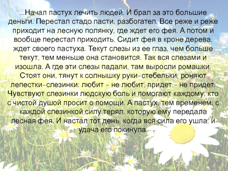 стадо пасти, разбогател. Все реже и реже приходит на лесную полянку, где ждет его фея. А потом и вообще перестал приходить. Сидит фея в кроне дерева, ждет своего пастуха. Текут слезы из ее глаз, чем больше текут, тем меньше она становится. Так вся слезами и изошла. А где эти слезы падали, там выросли ромашки. Стоят они, тянут к солнышку руки-стебельки, роняют лепестки-слезинки: любит - не любит, придет - не придет. Чувствуют слезинки людскую боль и помогают каждому, кто с чистой душой просит о помощи. А пастух, тем временем, с каждой слезинкой силу терял, которую ему передала лесная фея. И настал тот день, когда вся сила его ушла, и удача его покинула.