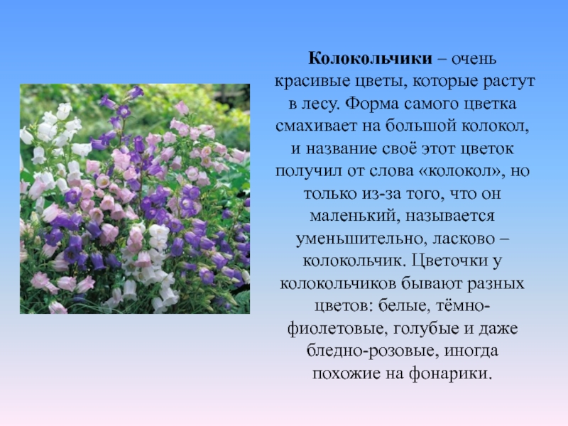 Слайд 11Колокольчики – очень красивые цветы, которые растут в лесу. Форма самого