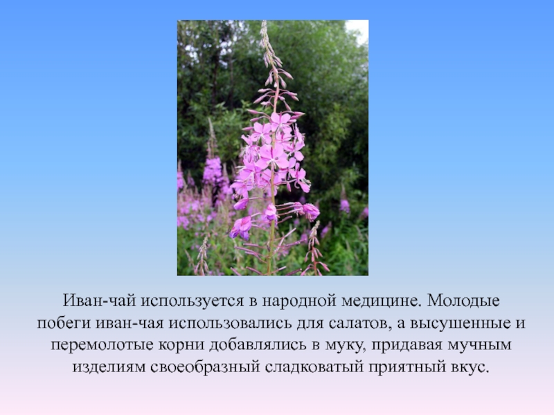 Слайд 18Иван-чай используется в народной медицине. Молодые побеги иван-чая использовались для салатов,