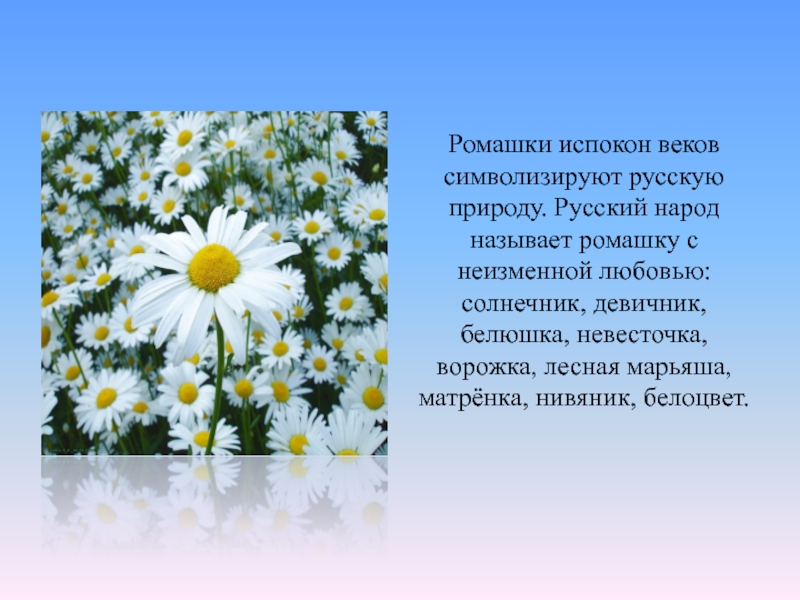 Слайд 6Ромашки испокон веков символизируют русскую природу. Русский народ называет ромашку с