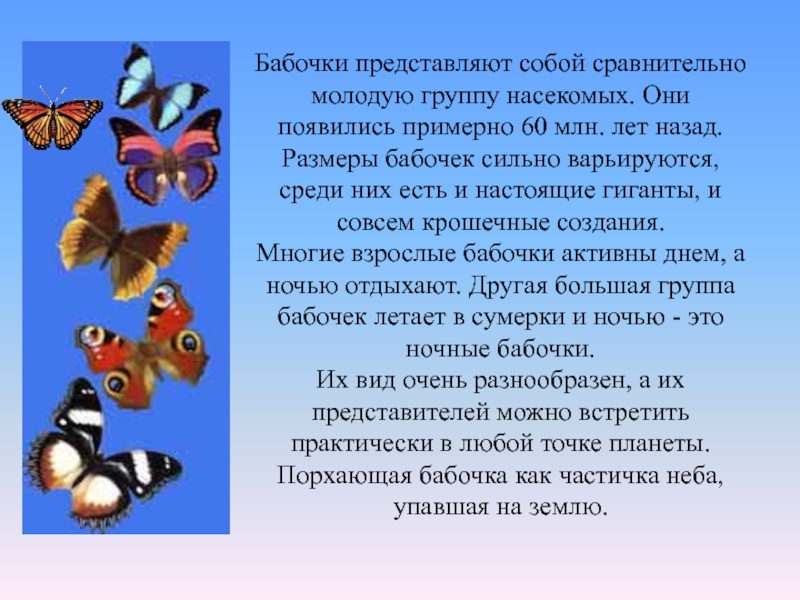 Слайд 29Бабочки представляют собой сравнительно молодую группу насекомых. Они появились примерно 60