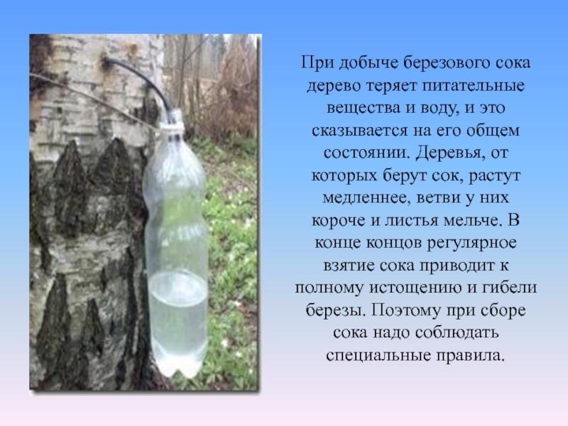 Слайд 23При добыче березового сока дерево теряет питательные вещества и воду, и