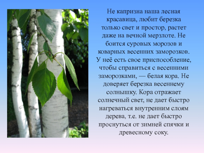 растет даже на вечной мерзлоте. Не боится суровых морозов и коварных весенних заморозков. У неё есть свое приспособление, чтобы справиться с весенними заморозками, — белая кора. Не доверяет березка весеннему солнышку. Кора отражает солнечный свет, не дает быстро нагреваться внутренним слоям дерева, т.е. не дает быстро проснуться от зимней спячки и древесному соку.