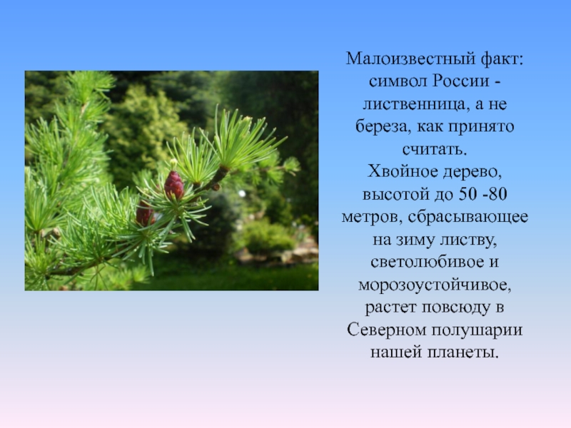 Слайд 25Малоизвестный факт: символ России - лиственница, а не береза, как принято