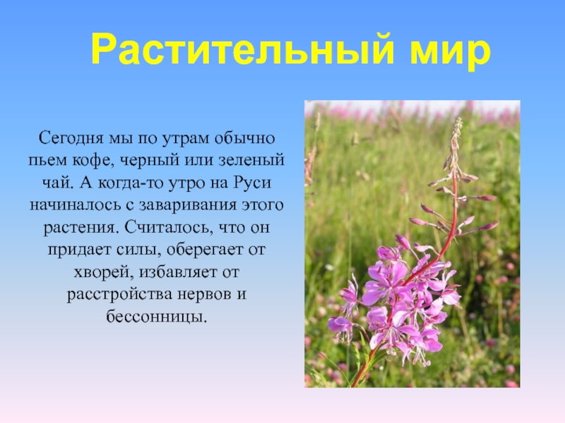 чай. А когда-то утро на Руси начиналось с заваривания этого растения. Считалось, что он придает силы, оберегает от хворей, избавляет от расстройства нервов и бессонницы.