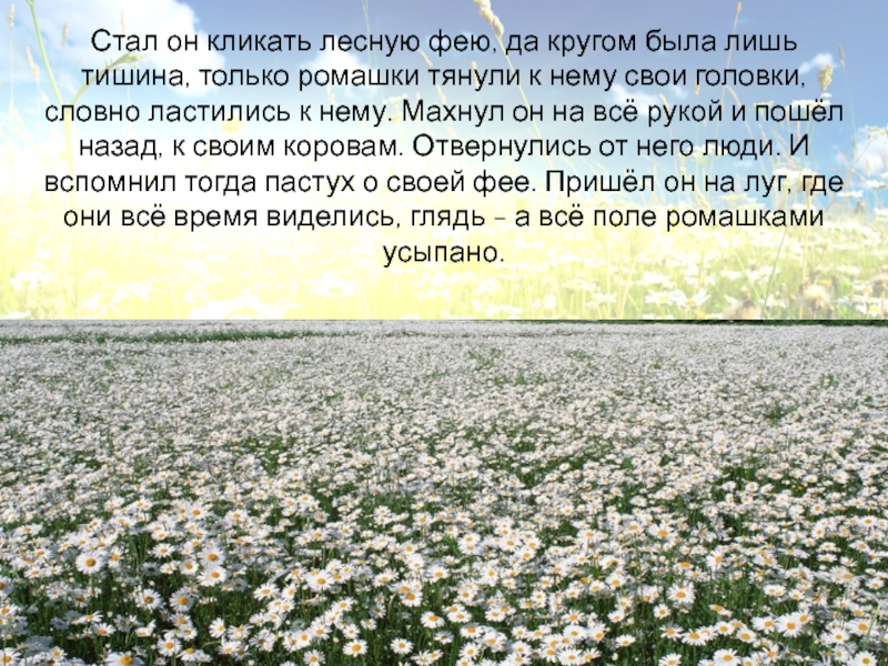 ромашки тянули к нему свои головки, словно ластились к нему. Махнул он на всё рукой и пошёл назад, к своим коровам. Отвернулись от него люди. И вспомнил тогда пастух о своей фее. Пришёл он на луг, где они всё время виделись, глядь - а всё поле ромашками усыпано.