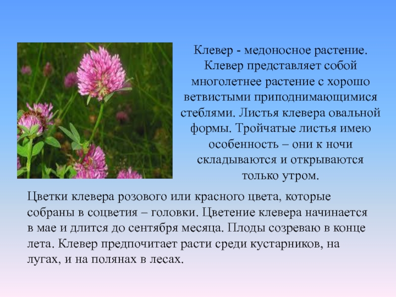 Цветки клевера розового или красного цвета, которые собраны в соцветия – головки. Цветение клевера начинается в мае и длится до сентября месяца. Плоды созреваю в конце лета. Клевер предпочитает расти среди кустарников, на лугах, и на полянах в лесах.