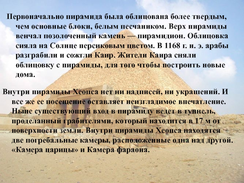 Слайд 4Первоначально пирамида была облицована более твердым, чем основные блоки, белым песчаником.