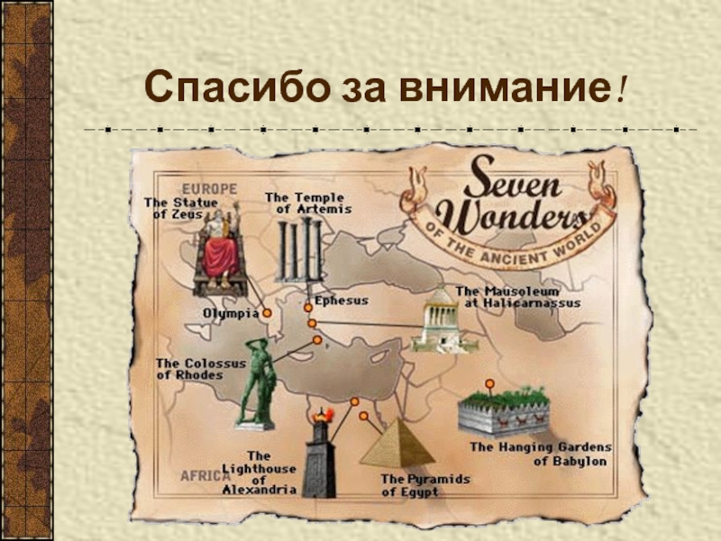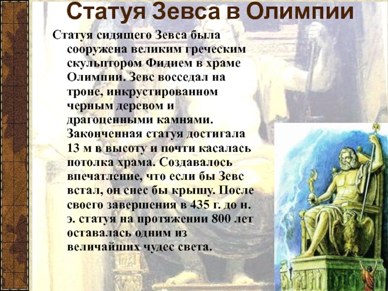 Фидием в храме Олимпии. Зевс восседал на троне, инкрустированном черным деревом и драгоценными камнями. Законченная статуя достигала 13 м в высоту и почти касалась потолка храма. Создавалось впечатление, что если бы Зевс встал, он снес бы крышу. После своего завершения в 435 г. до н.э. статуя на протяжении 800 лет оставалась одним из величайших чудес света.