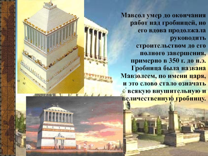 Слайд 11Мавсол умер до окончания работ над гробницей, но его вдова продолжала