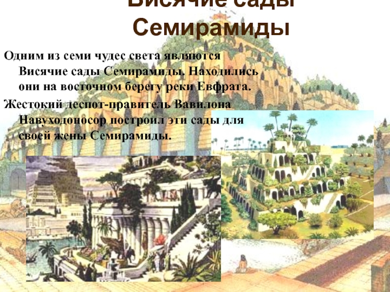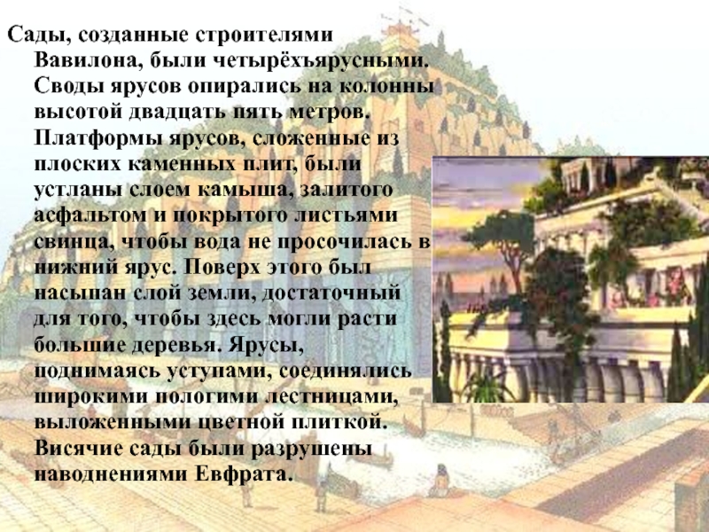 Слайд 6Сады, созданные строителями Вавилона, были четырёхъярусными. Своды ярусов опирались на колонны