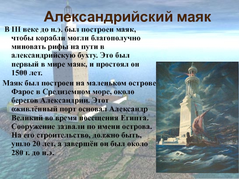 корабли могли благополучно миновать рифы на пути в александрийскую бухту. Это был первый в мире маяк, и простоял он 1500 лет.