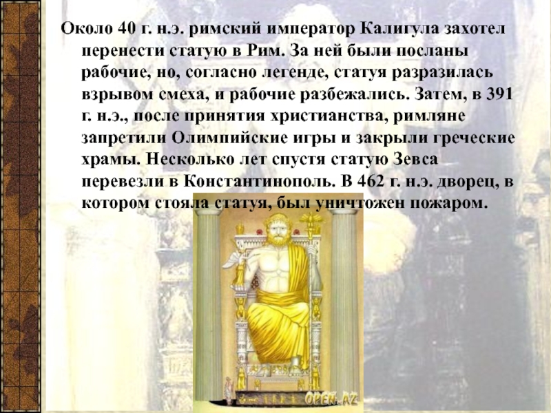 Слайд 9Около 40 г. н.э. римский император Калигула захотел перенести статую в