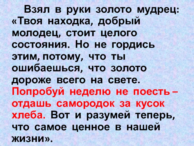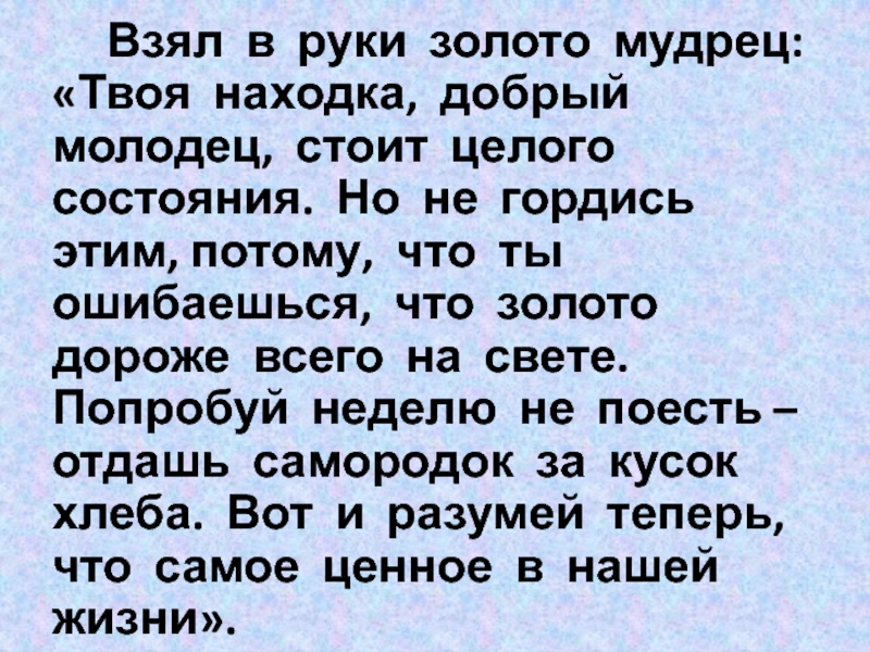 молодец, стоит целого состояния. Но не гордись этим, потому, что ты ошибаешься, что золото дороже всего на свете. Попробуй неделю не поесть – отдашь самородок за кусок хлеба. Вот и разумей теперь, что самое ценное в нашей жизни».
