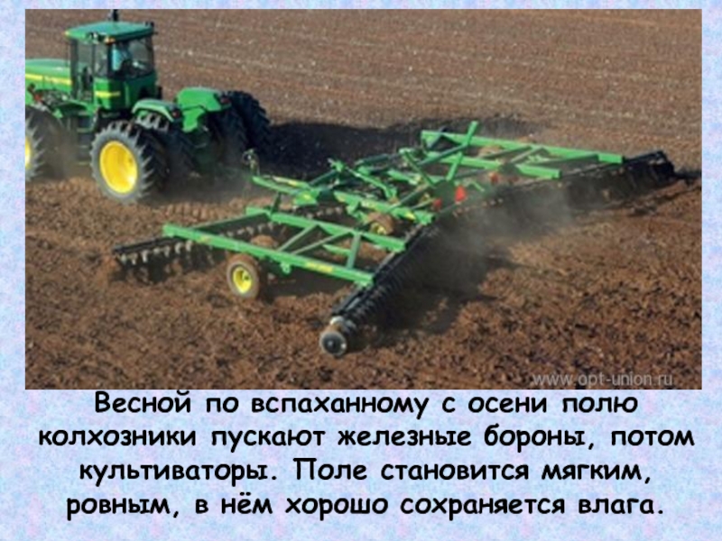 Слайд 6Весной по вспаханному с осени полю колхозники пускают железные бороны, потом