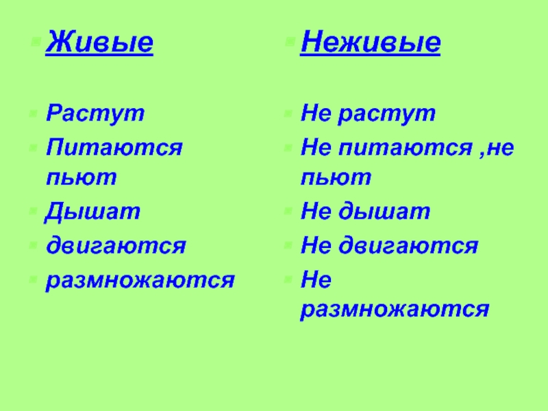 ЖивыеРастутПитаются пьютДышатдвигаютсяразмножаютсяНеживыеНе растутНе питаются ,не пьютНе дышатНе двигаютсяНе размножаются