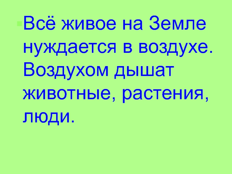 Всё живое на Земле нуждается в воздухе. Воздухом дышат животные, растения, люди.