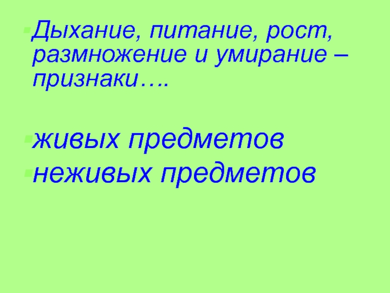 Дыхание, питание, рост, размножение и умирание – признаки….живых предметовнеживых предметов