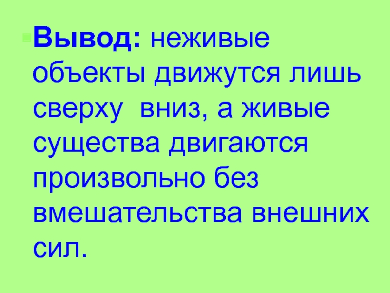 Вывод: неживые объекты движутся лишь сверху вниз, а живые существа двигаются произвольно без вмешательства внешних сил.