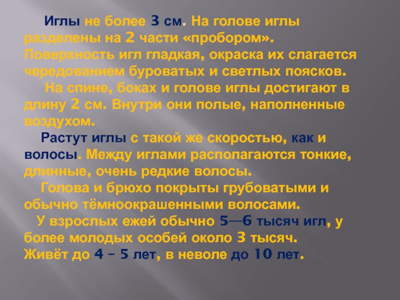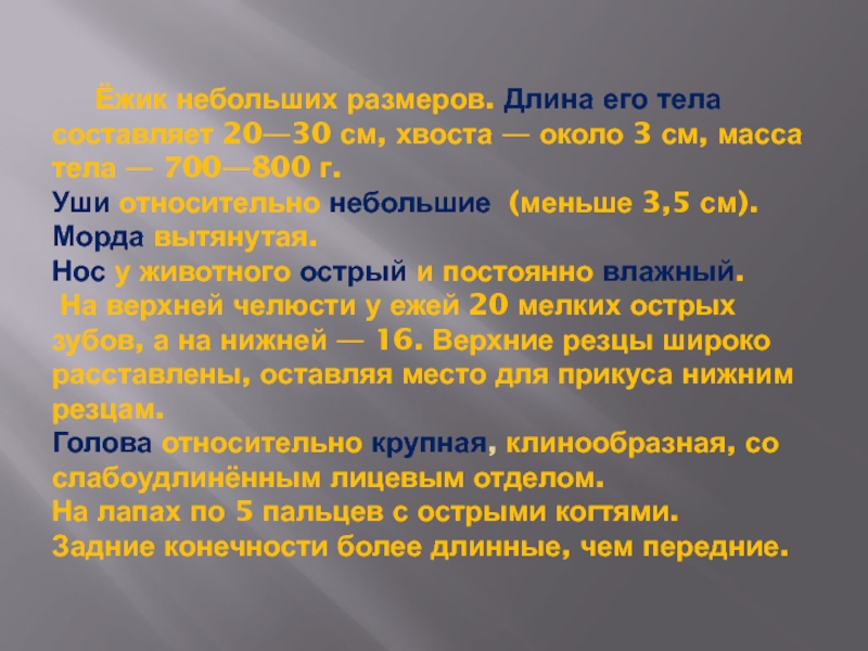 Слайд 11Ёжик небольших размеров. Длина его тела составляет 20—30 см, хвоста — около 3 см, масса