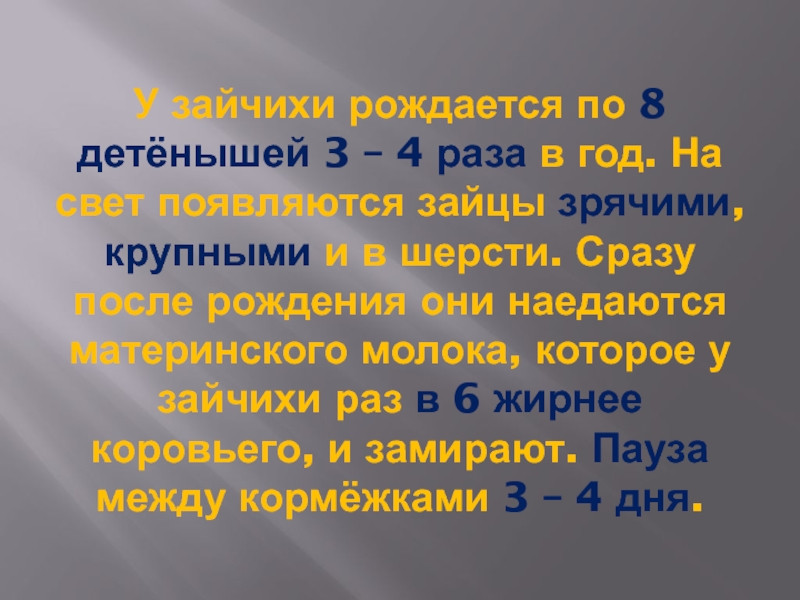 год. На свет появляются зайцы зрячими, крупными и в шерсти. Сразу после рождения они наедаются материнского молока, которое у зайчихи раз в 6 жирнее коровьего, и замирают. Пауза между кормёжками 3 – 4 дня.