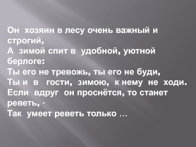 Слайд 13Он хозяин в лесу очень важный и строгий,