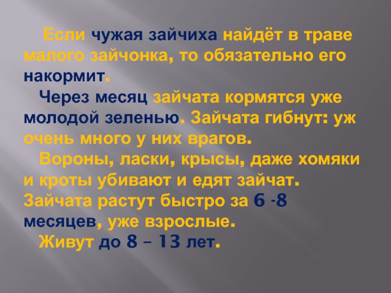 Вороны, ласки, крысы, даже хомяки и кроты убивают и едят зайчат. Зайчата растут быстро за 6 -8 месяцев, уже взрослые.