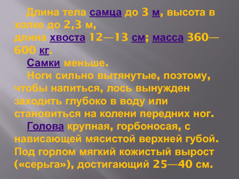 Слайд 24Длина тела самца до 3 м, высота в холке до 2,3 м, длина хвоста 12—13 см; масса 360—600 кг.