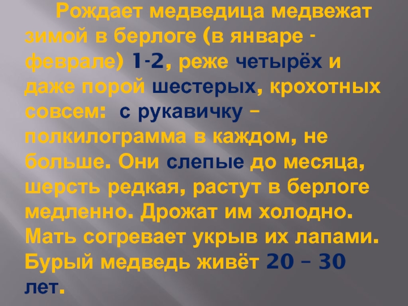 - феврале) 1-2, реже четырёх и даже порой шестерых, крохотных совсем: с рукавичку – полкилограмма в каждом, не больше. Они слепые до месяца, шерсть редкая, растут в берлоге медленно. Дрожат им холодно. Мать согревает укрыв их лапами.