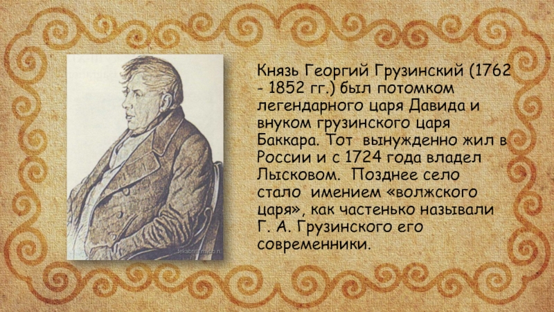 Давида и внуком грузинского царя Баккара. Тот вынужденно жил в России и с 1724 года владел Лысковом. Позднее село стало имением «волжского царя», как частенько называли Г. А. Грузинского его современники.