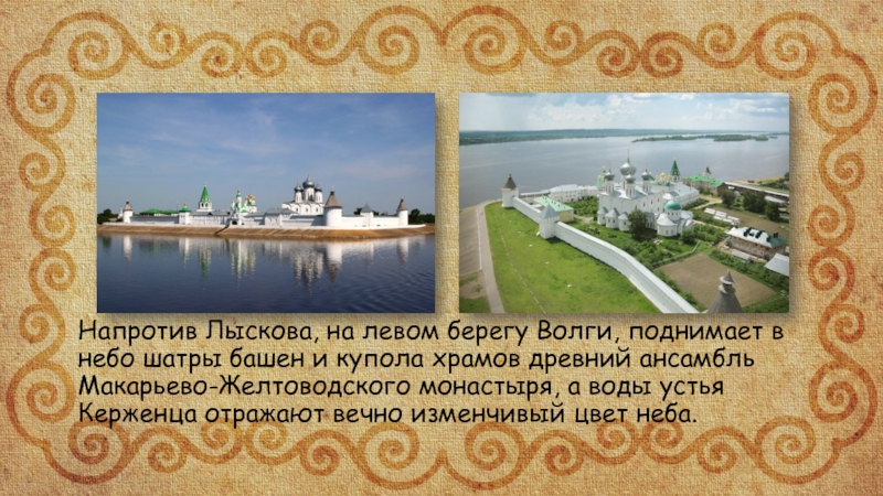 Слайд 5Напротив Лыскова, на левом берегу Волги, поднимает в небо шатры башен