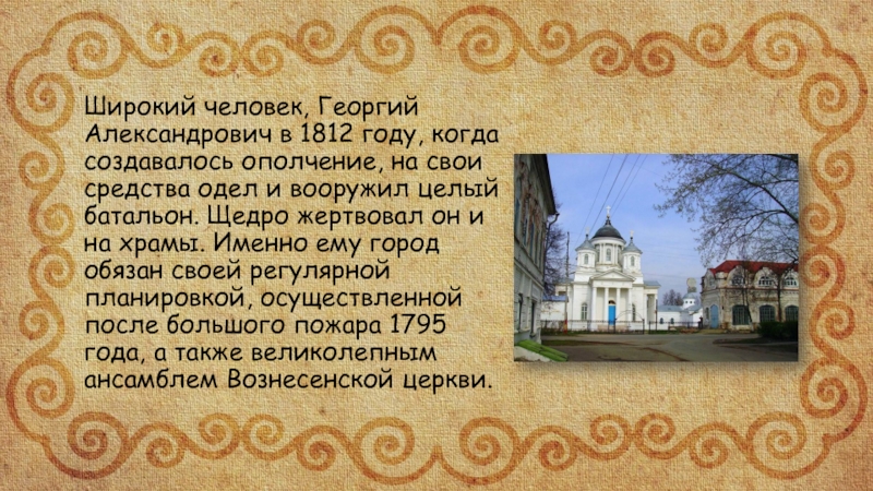 свои средства одел и вооружил целый батальон. Щедро жертвовал он и на храмы. Именно ему город обязан своей регулярной планировкой, осуществленной после большого пожара 1795 года, а также великолепным ансамблем Вознесенской церкви.