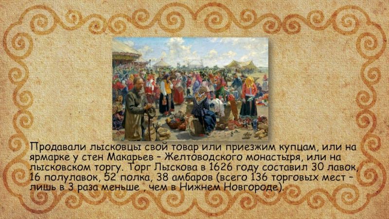 Слайд 20Продавали лысковцы свой товар или приезжим купцам, или на ярмарке у