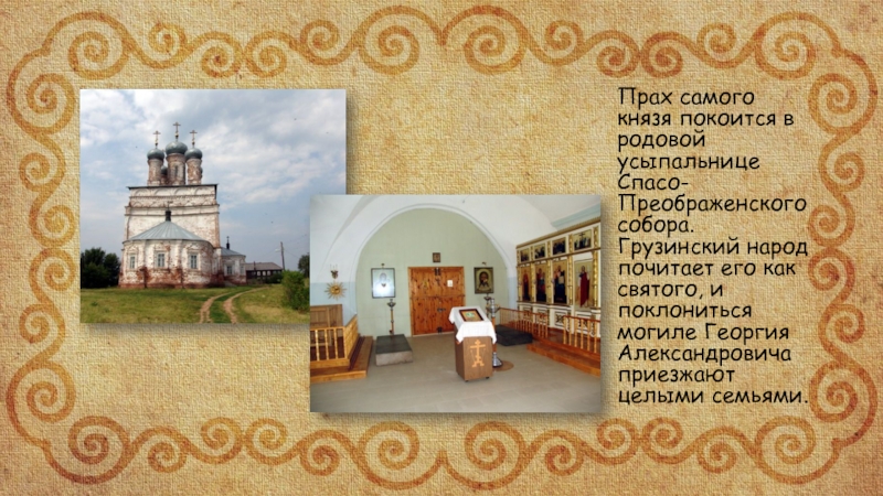 Слайд 31Прах самого князя покоится в родовой усыпальнице Спасо-Преображенского собора. Грузинский народ