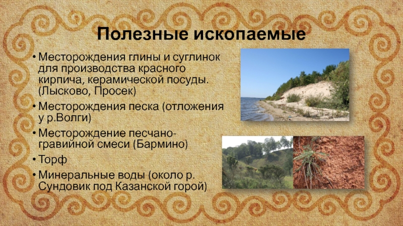 Месторождения глины и суглинок для производства красного кирпича, керамической посуды.